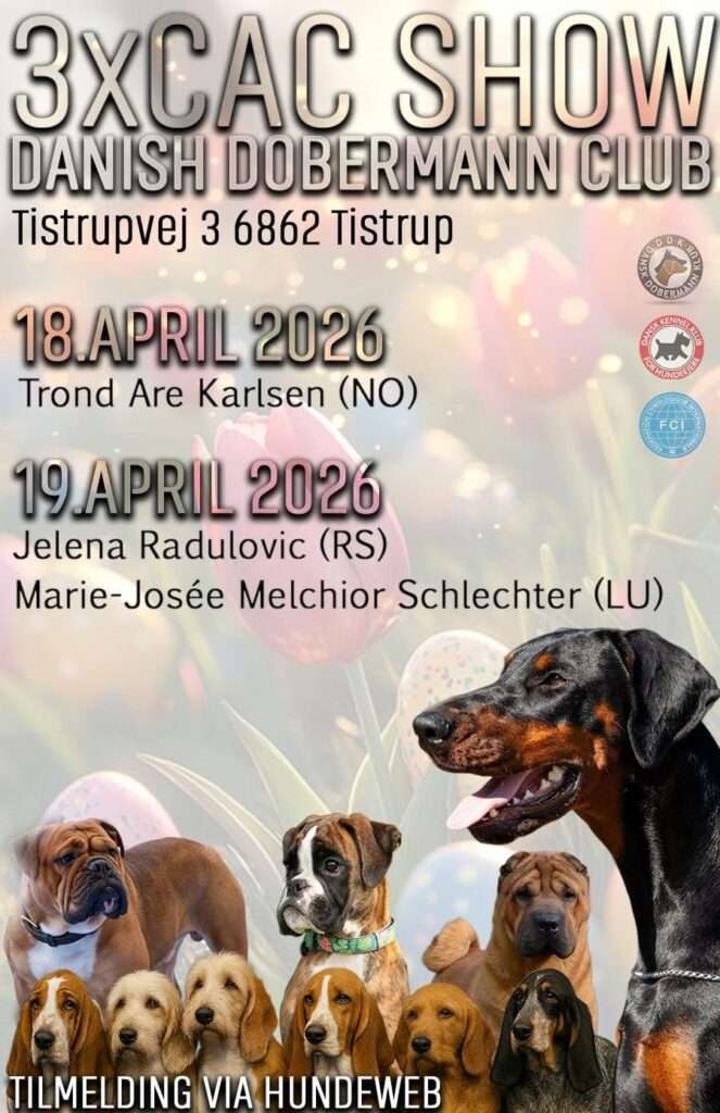 Lørdag den 18. april er det dommer Trond Are Karlsen fra Norge med Dobermann, Boxer, Shar Pei, OEB og Continental Bulldog i ringen.